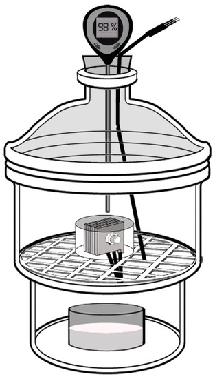 The monitor was placed in a glass desiccator, as shown in Figure 3. The relative humidity was modified with different saline solutions supersaturated under the ASTM E-104 standard [30]. The humidity measures selected during the experimentation phase were 40% RH using potassium carbonate (K2CO3) and 98% RH using potassium sulfate (K2SO4).