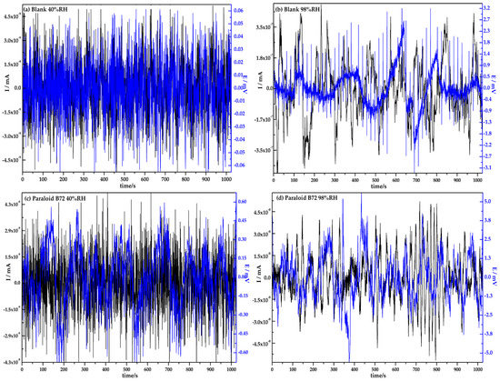Cast iron’s time series in current and potential for (a) blank at 40% RH, (b) blank at 98% RH, (c) Paraloid B72 at 40% RH, and (d) Paraloid B72 at 98% RH.