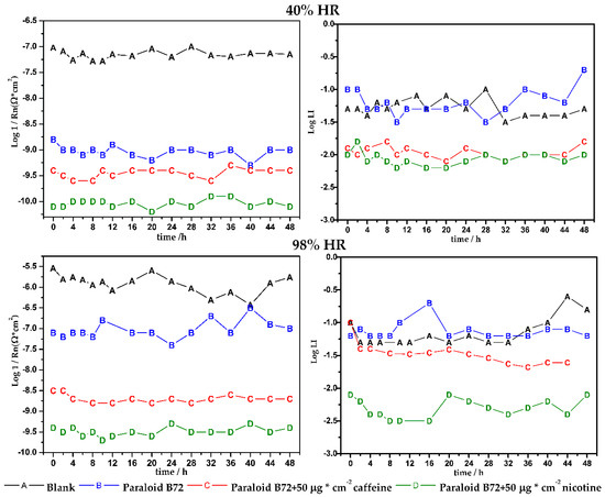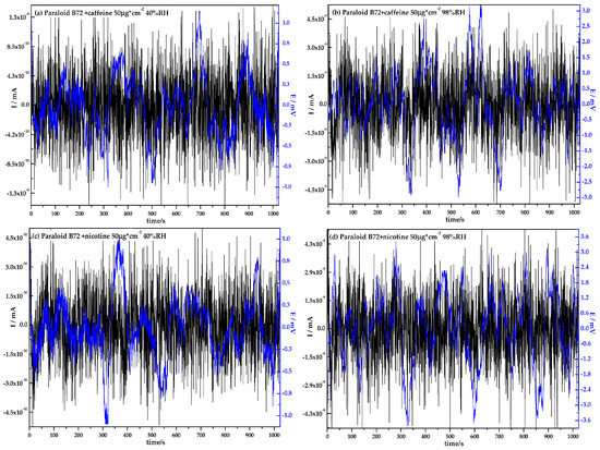 When caffeine is added to Paraloid (Figure 5a) at 40% RH, both current and potential responses decrease (5.06 × 10−9 mA, 0.36 mV) and (Figure 5b) for 98% RH (1.75 × 10−8 mA, 1.03 mV) almost an order of magnitude, while nicotine films (Figure 5c,d) have smaller values in current and potential at 40% RH (1.69 × 10−9 mA, 0.34 mV) as at 98% RH (1.68 × 10−9 mA, 0.93 mV) compared to Paraloid without inhibitor. This decrease in the amplitude and response in current and potential reveals the activity of these molecules on the superficial phenomenon of corrosion.