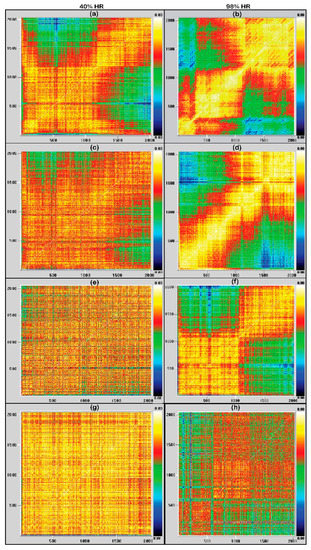 Recurrence plots of (a) Blank at 40% RH, (b) blank at 98% RH, (c) Paraloid B72 at 40% RH, (d) Paraloid B72 at 98% RH, (e) Paraloid B72 + µg∙cm−2 of caffeine at 40% RH, (f) Paraloid B72 + 50 µg∙cm−2 of caffeine 98% at RH, (g) Paraloid B72 + 50 µg∙cm−2 of nicotine at 40% RH, and (h) Paraloid B72 + 50 µg∙cm−2 of nicotine at 98% RH.
