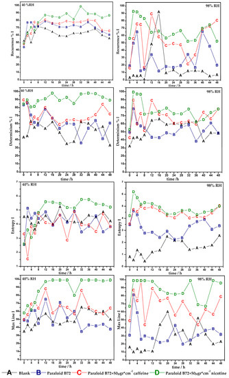 When the metal is coated with Paraloid, the formation of equidistant geometric structures was observed, which is presumed to be a more deterministic behavior. However, in this immersion condition, the recurrence plot shows a portion of reinforced parallel structures. The presence of caffeine and nicotine in two humidity conditions assessed features more structured graphics in comparison to the Paraloid, which will be reflected on signals with a higher degree of recurrence and will manifest themselves in a greater number of yellow and reddish spots. To this point, the analysis of graphs has been qualitative, and presumptive behavior may be viewed. To perform a more detailed analysis, we calculated the percentage of recurrence, the percentage of determinism, entropy and maximum line depending on weather for all series in the conditions evaluated at 40% and 98% relative humidity, set by the Euclidean method. The results are shown below in Figure 8.