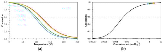 Using the kinetic parameters for the reaction between the furan-functionalized Jeffamines and the aromatic bismaleimide DPBM (Table A1 in Appendix A), the equilibrium conversion of the reversible Diels-Alder reaction can be calculated as a function of temperature for a fixed concentration of furan and maleimide functional groups (Figure 2a) or as a function of concentration at a fixed reference temperature (Figure 2b), using Equation (1), where [M]0 is the initial concentration of maleimide groups in the polymer network coating.