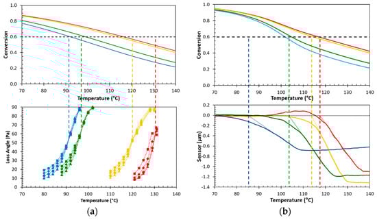 (a) Dynamic rheology measurements related to the equilibrium conversion simulations and (b) local thermal analysis measurements with the corresponding conversion profiles during heating of the LTA probe at 0.6 K·min−1 for DPBM-F230 (red), -F400 (yellow), -F2000 (green), and -F4000 (blue).