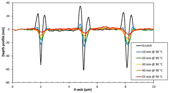 First, the microscopic healing behaviour of the DPBM-F400 is evaluated and applied as a coating onto an aluminium substrate. The coating material is a thermoset at room temperature with a glass transition Tg of about 80 °C and an elastic modulus in the GPa range. The nano-lithography option of the AFM was used to create microscopic damages to the coating surface. Using nano-lithography, well-defined forces can be exerted with the AFM tip onto the sample surface, resulting in scratches with well-controlled and reproducible depth and geometry. The evolution of the depth of the scratches in a fixed location is shown in Figure 5 (topography images see Appendix Figure A1), as the sample is intermittently heated to the isothermal healing temperature for a fixed amount of time and cooled back to room temperature for topography acquisition. The depth of the scratches is shown as a function of the healing times at 90 °C, showing successful closing of the defects within the time span of 1 h.