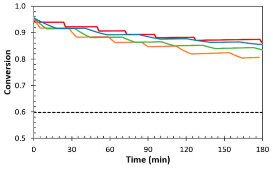 Conversion profiles for the quasi-isothermal heat treatments of the DPBM-F4000 coating at 70 °C (blue), 75 °C (green), 80 °C (orange), and 85 °C (red), as compared to the critical gel point conversion (dashed line). Temperature profiles are given in Figure A5.