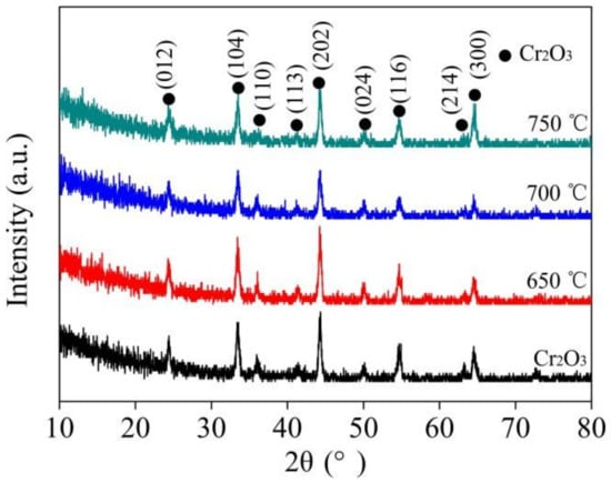 Figure 2 shows the XRD patterns of the pre-sealed and post-sealed Cr2O3 coatings by heat treatment at various temperatures. All the diffraction peaks could be indexed to the standard patterns of the corundum structure Cr2O3 (JCPDS No. 38-1479) in all coatings. No new diffraction peaks appeared in the sealed coatings. With increasing temperatures, the diffraction peaks of Cr2O3 first decreased and then increased. The position of the peaks shifting to a higher angle was observed in the sealed samples at 750 °C. It is speculated that a thin Al2O3 layer covering the Cr2O3 coating led to the decrease of its diffraction peaks. The increasing and shifting peaks were due to Al ions entering Cr2O3 to form (Cr1–xAlx)2O3 solid solutions.