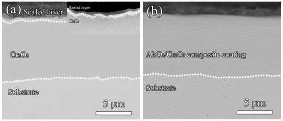 Al2O3 is also one of the most important oxide ceramics because of its high hardness, high chemical stability, and excellent wear and corrosion resistance. Some researches about the preparation of Al2O3 composites coating by electrodeposition have been reported [11,12,13]. Al2O3 can form an (Al1–xCrx)2O3 infinite solid solution with Cr2O3 due to their similar crystal structure. By introducing an Al2O3 sealing layer, a good interface between Al2O3 and Cr2O3 can be expected.