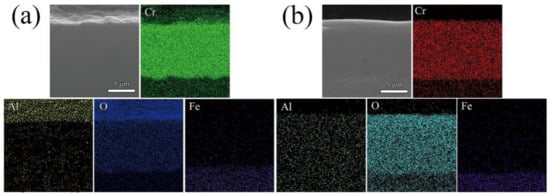 To give more insights into the effect of the sealing layer, the compositions of the cross section of the sealed coating before and after heat treatment at 750 °C was analyzed by EDS. The corresponding element maps are shown in Figure 6. It is clearly observed from Figure 6a that Al element was uniformly distributed in the sealed layer, suggesting that a uniform Al2O3 layer formed; the EDS elemental maps of the heat-treated sealed coating (Figure 6b) show that Al element was uniformly distributed in the whole Cr2O3 coating, suggesting that a uniform Al2O3/Cr2O3 composite ceramic coating was formed.