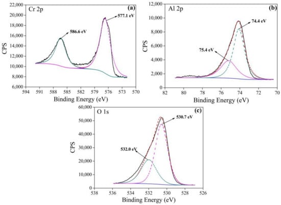 In order to identify the chemical states of Al, Cr, and O, XPS analysis was performed. Figure 7a displays that the binding energies of Cr 2p1/2 and Cr 2p3/2 were located at 586.6 and 577.1 eV, respectively, which correspond to Cr3+ of Cr2O3 in accordance with the values previously reported in the literature [20]. The XPS spectra of Al 2p (Figure 7b) revealed that there was a peak at 75.4 eV, which corresponded to the binding energy of Al2O3. Furthermore, a second peak at a low binding energy (74.4 eV) developed considerably, indicating the breakdown of Al–O bonds and the formation of a complex oxide Cr–O–Al [21]. Figure 7c shows the O 1s XPS spectrum which could be deconvoluted into two peaks at 530.7 and 532.0 eV, respectively. According to the literature [22,23], O 1s binding energy (BE) values for Cr2O3 change from 530.0 to 530.8 eV, while those for Al2O3 appear to be around 531.6 eV. Therefore, the O 1s peak positions of 530.7 eV was attributed to Cr2O3, while that located at 532.0 eV was attributed to Al2O3.