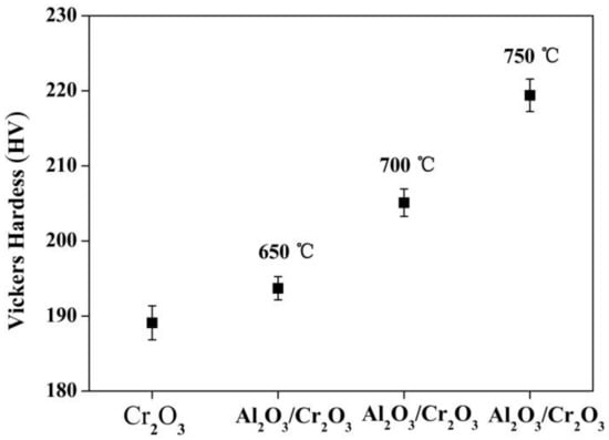 Vickers hardness of Cr2O3 and Al2O3/Cr2O3 composite coatings heat-treated at different temperatures.