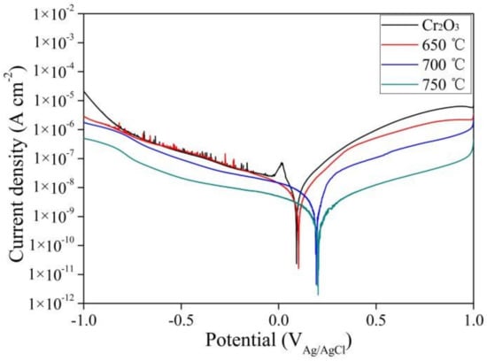 To confirm the sealing performance of the Al2O3 layer, the samples were characterized by electrochemical corrosion tests. Figure 9 shows the potentiodynamic polarization curves of Cr2O3 and Al2O3/Cr2O3 composite coatings at different temperatures. In the polarization curves, positive corrosion potential and negative corrosion current density represent lower corrosion rate and good anti-corrosion behavior. The electrochemical parameters calculated from the polarization curves are listed in Table 1. From Figure 9 and Table 1, it can be seen that the corrosion potential of the composite coating at 650 °C shifted about 31.0 mV (vs Ag/AgCl) to a positive direction, while the corrosion current density decreased to 1.32 × 10−9 A cm−2, lower than that of the Cr2O3 sample. With the increase of temperature, the corrosion potential persistently increased, and the corrosion current density decreased continually. The composite coating at 750 °C exhibited the best corrosion resistance with a current density of 6.64 × 10−10 A cm−2 and a corrosion potential of 224.0 mV.