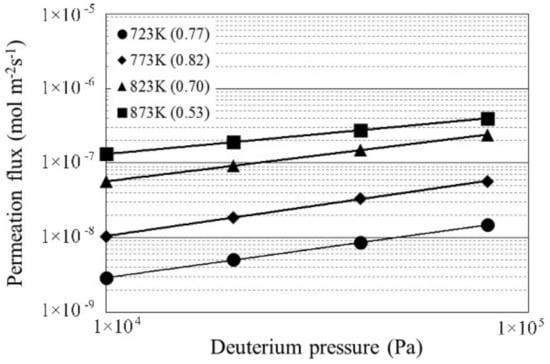 Deuterium permeation flux through the composite coated sample as a function of the driving pressure at different temperatures.