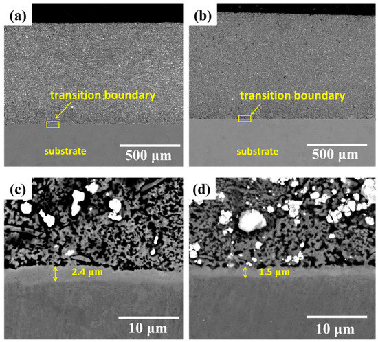 Cross-sectional FESEM backscattered electron images of both HEACs are shown in Figure 4. It is obvious from Figure 4a,b that the average thickness values of coatings are of 860 and 900 μm for 10 and 30 wt.% WC HEACs, respectively. The zoomed-in views in the transition boundary regions marked by the square for both HEACs are shown in Figure 4c,d. The span of transition boundaries in 10 and 30 wt.% WC coatings were about 2.4 and 1.5 μm, as shown by the two-way arrows. It is clear that the transition boundary regions in both HEACs were dense, and no cracks or any other defects appeared, indicating a good metallurgical bonding between coatings and substrate. Moreover, the relative density of all sintered coatings, which was calculated with respect to actual density and theoretical density, reached up to 97% (Table 4). It suggests that the coatings with high sintering quality had been acquired.