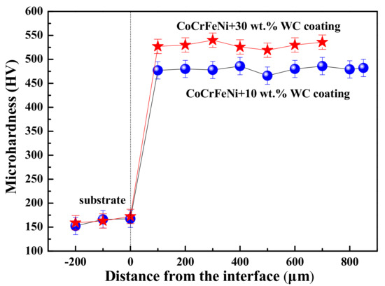 Figure 5a shows the variation of cross-sectional microhardness distribution of the HEACs and substrate. The microhardness values of the CoCrFeNi(WC) coatings were much higher than that of substrate. The average microhardness values of CoCrFeNi HEACs with 10 and 30 wt.% WC additions HEACs reached 475 and 531 HV respectively. For the 30 wt.% WC coating, the microhardness was more than 3 times larger than the substrate (160 HV). Moreover, compared with the previous study [13], the WC additions obviously enhanced the microhardness of CoCrFeNi HEAC (450 HV). These improvements of microhardness may be attributed to two major causes. First, combined with the crystallite size calculated using the Scherrer formula, it also revealed the decreasing trend with W addition, further indicating the grain refinement strengthening effect. Second, the WC hard phases could be responsible for the enhanced microhardness on the basis of a second-phase particle strengthening mechanism. Moreover, it was observed that the WC particles homogeneously distributed in the matrix, which further contribute to the improvement of mechanical properties. Therefore, it also effectively hindered the motion of dislocation; hence the microhardness of WC addition coatings became increased. In addition, compared with the 10 wt.% WC coating, the 30 wt.% WC HEAC possessed a more dense distribution of WC particles, which was beneficial to further improve the microhardness of the coating.
