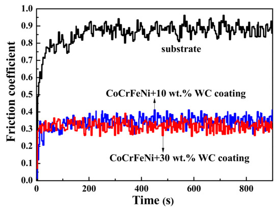 The friction coefficients for Q235 steel substrate and CoCrFeNi(WC) HEACs are shown in Figure 6. It was noticed that periodic waves with fluctuation were observed, and characterized the friction coefficient of the tested samples. This is thought to be caused by two factors. The first is the periodically localized fracture of the surface layer. The second is periodic accumulation and elimination of the debris on worn surface [19]. However, the friction coefficients of the tested samples gradually reached a relative constant value as testing time increased. The mean friction coefficients of CoCrFeNi HEACs with 10 and 30 wt.% WC addition were 0.34 and 0.30 respectively, which were more than 61% lower than that of Q235 substrate (0.87).