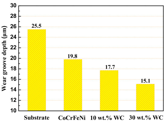In addition, the mean friction coefficient of CoCrFeNi HEAC was 0.38 [13], which was also higher than that of WC addition HEACs. Correspondingly, WC additions were beneficial for improving the wear resistance of CoCrFeNi HEAC. Moreover, the enhancement effect was more feasible with increasing the additional contents of WC. For further characterizing the wear resistance of the tested samples, the wear groove depths were obtained through transition region 3D morphologies from the wear surface to the groove bottom, as shown in Figure 7. The corresponding values of the wear groove depth are revealed in Figure 8. The values of the wear groove depth for HEACs with 10 and 30 wt.% WC additions were 17.7 and 15.1 µm, respectively, and were shallower than those of the substrate (25.5 µm) and CoCrFeNi HEAC (19.8 µm). This further proves the excellent wear resistance of HEACs with WC additions.