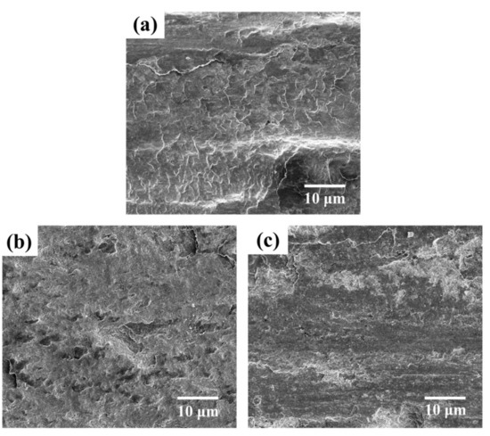 The worn surface morphologies of the substrate and CoCrFeNi(WC) HEACs are shown in Figure 9. Under the combined effect of the normal and tangential force, the Q235 steel underwent intense plastic deformation easier due to its low microhardness (Figure 9a). The adhesive wear behavior appeared, which was evidenced by the severe peeling off of materials and the clear ploughed furrow structures. The worn surfaces of CoCrFeNi(WC) HEACs became smoother than that of the substrate after the wear test, as shown in Figure 9b,c. The plastic deformation was weakened to a certain extent, and a small quantity of plowing grooves appeared on the worn surface of the tested coatings. Furthermore, plowing grooves started to cut down and lessen when the mass fraction of WC increased from 10 to 30 wt.%. It is well known that the wear resistance is proportional to the hardness of the alloy according to Archard’s laws [20]. The microhardness values of HEACs were higher than those of the substrate and CoCrFeNi HEAC, which further confirms this hypothesis.