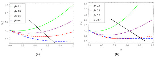 Figure 2 demonstrates the thin film thickness during the fluid motion. In the performance of coating, thin film thickness play a key role. Physically, the thickness of the films is directly related to the velocity. Figure 2b reflects a more rapid variations in under smaller values of and S as compared to the results observed in part (a). The velocity of the fluid decreases with an increase in the thickness parameter . It happens because for larger values of the fluid viscosity increases, and as a result a gradual fall can be observe in the gradient of the velocity profile.
