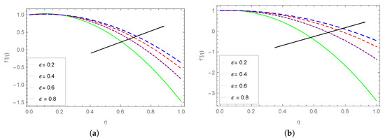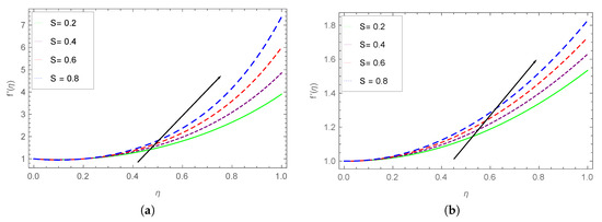 Figure 3 illustrates the effect of the stretching parameter . The velocity profile shows an increase with the increasing values of , because the lower plate always behaves directly to the flow fluid velocity. Physically, for , the surface accelerating rises, decelerating the surface, while depict the random motion of the surface. Figure 3b reflects the sensitivity of , under smaller values of and S.