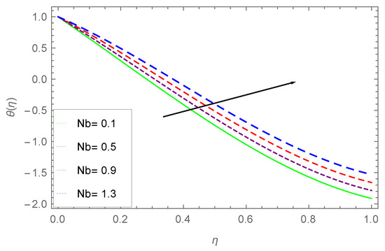 Figure 7 illustrates the temperature distribution under Brownian motion parameter . In general, due to the irregular motion of the particles, this causes a collision between these particles. An increase in heat of the fluid can be seen with the ascending order of the Brownian motion parameter , consequently, free surface nanoparticle volume friction decreases.