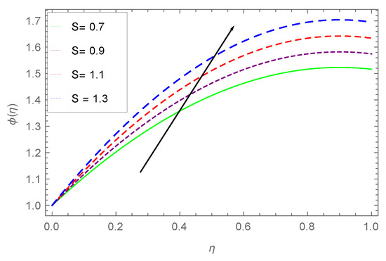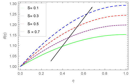 The impact of the unsteadiness parameter S on the heat profile is presented in Figure 8. It is observed that varies directly with S. An increase in S increases the temperature of the fluid, which further increases the kinetic energy of the fluid, and results in increment of the liquid film motion.