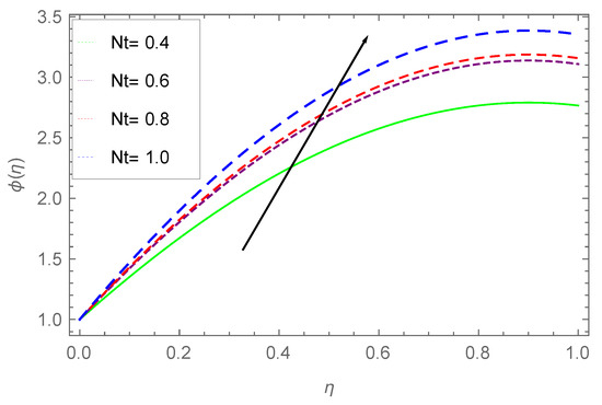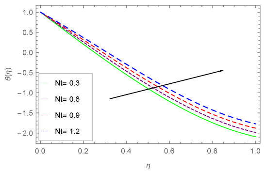 Figure 9 illustrates the effect of thermophoresis parameter on temperature profile. The limitations thermophoresis helps in the increase of a surface temperature. The irregularity in motion (Brownian motion), causes a temperature increase due to the kinetic energy produced by nano suspended particles, which results in thermophoretic force generation. The intensity produced by this force compels the fluid to move away from the stretching sheet. As a result, larger values of cause an increase in temperature, due to which the surface temperature also increases.