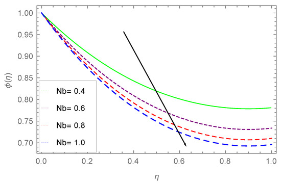 The effect of Brownian motion parameter on is shown in Figure 11. Brownian motion is the irregular motion fluid particles. At molecular level Brownian motion of micropoler nanofluid leading the thermal conductivity of nanofluids. The figure describes an inverse relation between the concentration profile and . The boundary-layer thicknesses diminishes due to an increase in , which results in reducing the concentration.