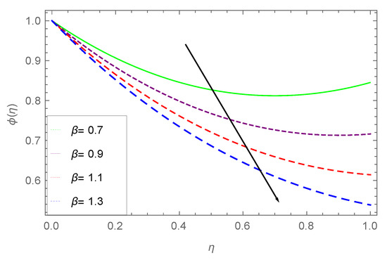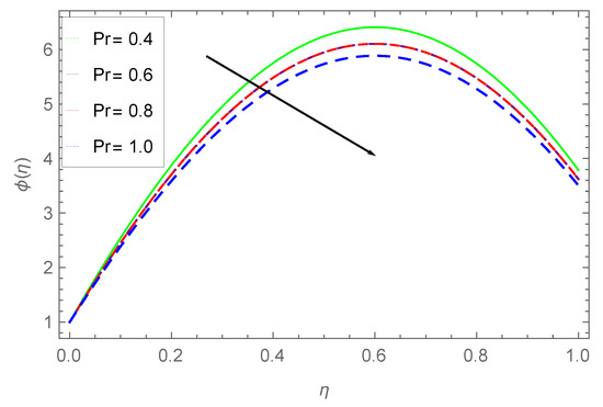 The impact of on is shown in Figure 13. Larger values of the Prandtl number cause the concentration to falls down. The information from the figure reveals that large values of cause the concentration profile to fall down. Physically, the thermal boundary-layer vanishes with greater values of and as a result the concentration profile falls. The same phenomenon is observed for the heat profile.