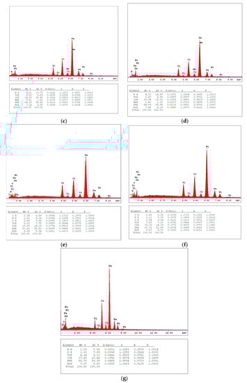 EDX of TiN (a,b), annealed TiN at 400 °C in vacuum (c,d), annealed TiN at 400 °C in air (e,f), and TiNxOy (g).