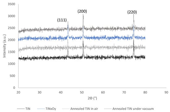Figure 3 shows the XRD of both TiN, TiNxOy, annealed TiN in air and in vacuum thin films, from which it is shown that all conditions show signals at almost the same angles. The XRD patterns reveal that TiN and TiNxOy thin films exhibit crystalline structures. The presence of three peaks are marked out on the XRD pattern for all thin films as shown in Figure 3. These peaks correspond to the (111), (200), and (220) planes, respectively, which were reported for TiN thin films [30] and TiNxOy thin films [8], suggesting some overlapping of the signals with those obtained from the substrate (111). The SS substrate showed (111) peak at angle 2θ = 44.49. Different angles of TiN peaks are reported in literature [12,16,24,29] (as shown in Table 2), this is probably due to the different stichometry of TiN structure obtained from different manufacturing techniques of thin film. The lattice parameter of the as-deposited TiN with an austenitic microstructure was calculated by Bragg’s Law for the (111), (200), and (220) peaks and was found to be 3.6 Å [29]. In the lattice structure, Ti sites are completely filled and vacancies exist only on the N sites. However, several research works [12,25,29] have illustrated the formation of nonstoichiometric (sub or over) TiNx, which exhibits deficient Ti atoms and has superior properties. This suggests that the structure is TiNx [25]. It is also noted from Table 1 that an increase in the Ti at % occurs after annealing the TiN thin film. This suggests reducing defects as defects are associated with N sites in TiN.