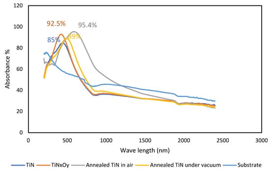 The optical absorbance of the material obtained in this work, as shown in Figure 4, illustrates a red shift in the absorbance properties toward higher wavelengths for the annealed TiN in air and vacuum. This shift is larger for the annealed in air TiN. As shown from EDX results, and in Figure 2e,f and in Table 1, this red shift may be attributed to the increase in O2 and C [36,37]. These results prove that TiN which is deposited under promoting N/Ti ratios in the range (1:1.43–1.66) or N compositional range of 65–70 at % is a good candidate for SSA applications, after vacuum and air annealing at 400 °C.
