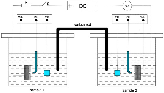 A 3.5% NaCl solution (pH = 7) was prepared with analytical reagents and deionized water to simulate the coastal environment. The electrochemical testing and stray current loading device is shown in Figure 2. We used a constant voltage adjustable DC power supply (KXN-305D, Zhaoxin, Shenzhen, Guangdong, China) as a stray current source. S is a switch. R is a resistor. Samples 1 and 2 were connected to the positive and negative electrodes, respectively. A carbon rod was placed in the middle to form a closed circuit. In this configuration, DC flowed out of the damage point of Sample 1 to form an anode metal corrosion area. In contrast, a cathode area formed on Sample 2.