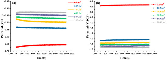 Generally, in aerobic neutral or alkaline solutions, the electrochemical corrosion of metals is called oxygen uptake corrosion, and the cathodic reaction at this time is called an oxygen uptake reaction. However, due to the large stray current in the buried metal pipeline, the cathode potential is negative. As Figure 4 showed, when the current densities were 20 and 40 A/m2, the reaction potentials were lower than the standard potential of HER (EV,SCE = −1.056 V [33]). Therefore, cathodic reactions of stray currents are dominated by the hydrogen evolution reactions.