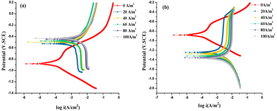 Figure 5 shows the polarization curves of 3PE-coated X80 steel samples under DC polarization interference at different currents. The kinetic parameters listed in Table 1 and Table 2 were obtained by fitting the polarization curves, performed as described elsewhere [23,24,25,26]. Bertocci [27] pointed out that the metal corrosion potential shifts under the influence of stray currents, but the direction of this shift depends on the ratio of the absolute values of the Tafel slope between the anode and the cathode ( At , the corrosion potential will not shift. At or , the corrosion potential will shift negatively or positively, respectively. In general, the DC polarization has a great influence on the Tafel constant. From Figure 5a, it can be seen that, when anode potential is applied to the system, the Tafel constant of the anode and cathode side are obviously changed, and the effect on the cathodic polarization side plot is obviously greater than that of the anode polarization. It can be seen from Figure 5b that, contrary to the direct current anodic polarization, the influence of the direct current cathode on the anodic polarization side plot process of X80 steel is significantly greater than that of the cathodic polarization process.