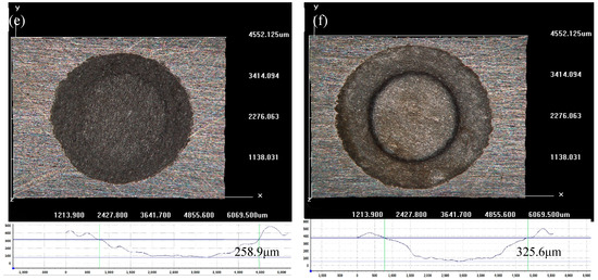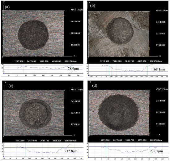 Figure 6 shows the depth of the corrosion pits of the X80 steel samples under DC anode interference obtained using three-dimensional (3D) digital microscopy. Figure 7 shows the relationship between the corrosion pit depth and the corresponding current density at the damage point of the coating. The corrosion pits deepened as the DC increased. The depth of the pits represents the severity of the corrosion [29]; thus, in our experiments, the corrosion rate was higher at higher DC current densities, which is in good agreement with Equation (6).