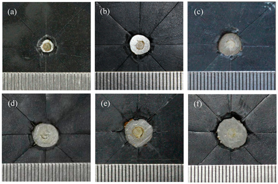 Photographs of the cathodic disbondment of the 3PE coating of the X80 steel samples under DC cathode current densities equal to (a) 0 A/m2, (b) 20 A/m2, (c) 40 A/m2, (d) 60 A/m2, (e) 80 A/m2, and (f) 100 A/m2.