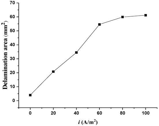 Figure 8 shows cathodic disbondment of the 3PE coating of the X80 steel samples caused by a DC stray current. Figure 9 demonstrates the relationship between the cathodic disbondment area and the stray current density. During our experiments, we observed a large number of bubbles at the damaged areas. We speculate that the cathodic reaction of stray currents generated both H2 and OH− ions. However, the hydrogen evolution process dominated, weakening adhesion between the coating and the metal substrate and leading to the coating delamination. The delamination area of the coating first increased as the initial stray current increased but then stabilized and remained unchanged. Thus, stray current has a critical current density value for the disbonding failure of the buried metal pipeline coating. When the stray current density is less than its critical value, the peel area of the coating varies with the current density. When the stray current density is greater than its critical value, delamination area of organic coatings remains unchanged as the current density changes. Cao [34] observed the same behavior of the disbondment as a function of the DC current density even though his experiments were performed under different conditions.