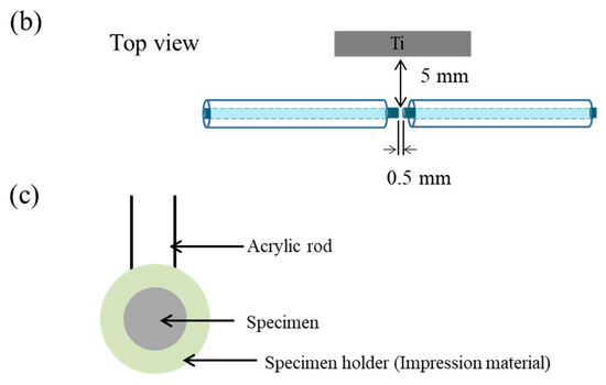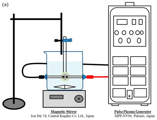 A solution plasma treatment was performed in 150 mL of the mineralizing solution at 29 °C. A pulse plasma generator (MPP-NV04, Pekuris, Tokyo, Japan) was used and the polished-Ti and porous-Ti substrates were placed at a distance of 5 mm from the electrodes within a glass vial (Figure 1). Plasma was generated at a voltage of 5 V and pulse width of 3 µs for 30 min. The mineralizing solution was stirred using a magnetic stirrer (Ion Stir 7d, Central Kagaku Co., Ltd., Tokyo, Japan) at a rotational speed of 240 rpm. The duration of the solution plasma treatment was 30 min.