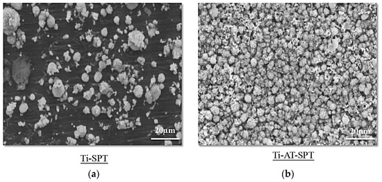 SEM images of HA crystals precipitated on Ti-SPT (a) and Ti-AT-SPT (b). The HA spherical particles formed on both the Ti-SPT and the Ti-AT-SPT. The spherical particles precipitated sparsely and did not cover the whole surface of the Ti-SPT, while the fine spherical crystals precipitated and covered the whole surface of the Ti-AT-SPT.