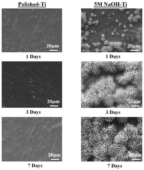 Figure 3 shows the SEM photographs of the polished titanium surface after SPT (Ti-SPT) (Figure 3a) and after 5 M NaOH treatment and subsequent SPT (Ti-AT-SPT) (Figure 3b). Crystals formed on both the Ti-SPT and the Ti-AT-SPT. Crystals with diameters between 5 and 20 μm precipitated sparsely and did not cover the whole surface of the Ti-SPT, while fine spherical crystals with a diameter of 5 μm precipitated and covered the whole surface of the Ti-AT-SPT.
