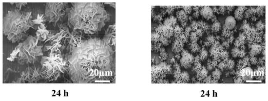 Figure 7 shows the SEM photographs of the polished titanium after immersion in the calcium phosphate solution at 60 °C (Ti-IT60°) and after 5 M NaOH treatment and subsequent immersion in the calcium phosphate solution at 60 °C (Ti-AT-IT60°). No spherical particle precipitation was observed on the Ti-IT60° after immersion in the solution for 30 min. Precipitated crystals between 5 and 40 μm in diameter were found on the Ti-IT 60° after immersion for 6 h, and these HA spherical particles grew into large size spherical particles between 40 and 100 μm in diameter after immersion for 24 h. On the Ti-AT-IT60°, small crystals precipitated after immersion for 30 min. The density of the crystals increased due to the growth of crystals with time. From the results shown in Figure 6 and Figure 7, it was observed that the crystal formation and its growth rate were markedly enhanced with 5 M NaOH treatment as well as an increase in the temperature of the calcium phosphate solution.