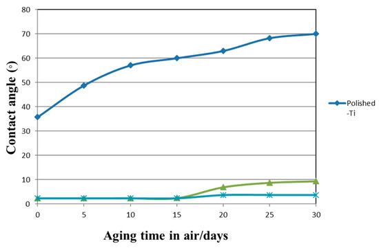 The changes in contact angle of water droplets on Polished-Ti, Ti-AT, and Ti-AT-SPT with aging time are shown. The contact angle for Ti-AT and Ti-AT-SPT was much lower than that for Ti throughout the aging period.