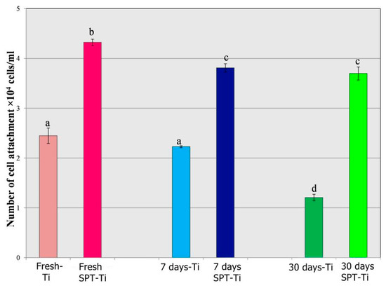 The number of attached cells on surfaces after 4 h incubation. The number of MC3T3E1 cells attached to the Polished-Ti and Ti-AT-SPT with 0, 7, and 30 days aging in air is shown in the SEM and graph. Different letters in the graph mean statistical difference at p < 0.05.