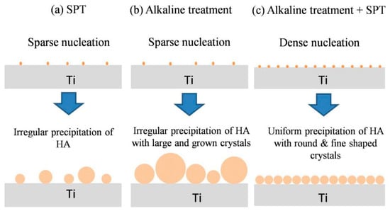 Schematic illustration of HA nucleation and HA crystal growth on the titanium surfaces. The appearance of particles formed on the Ti surface was quite different among (a) Ti-SPT, (b) Ti-AT-IT, and (c) Ti-AT-SPT.