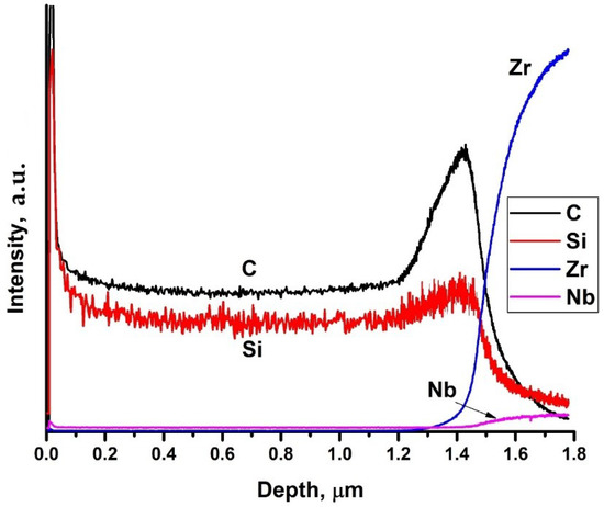 The energy dispersive X-ray analysis of the deposited coatings shows that Si/C ratio in the coating was 47/53. Distribution profiles of elements in the depth are presented in Figure 2. It is evident that the silicon and carbon are homogeneously distributed over the thickness of the coating. During deposition the C-rich interface between the coating and substrate is formed. The coating thickness is 1.5 μm, which well correlates with SEM data. Increase of the intensities of Zr and Nb lines at the depth higher that 1.4 μm is associated with the beginning of substrate sputtering.