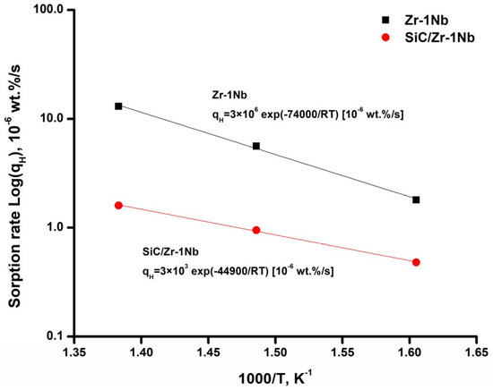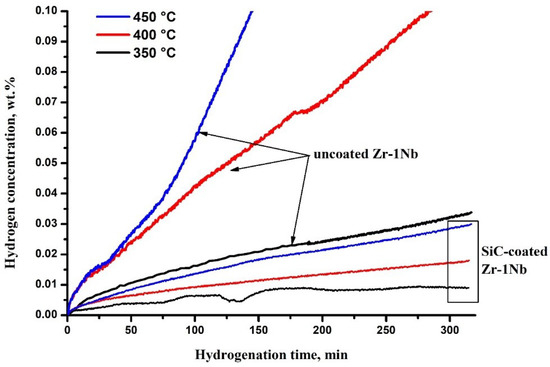 To analyze the kinetics of hydrogen sorption, the Arrhenius plots for hydrogen sorption rate were plotted in Figure 4. The linear dependencies in Figure 4 indicate that the hydrogen sorption kinetics of uncoated and SiC-coated alloys meets the Arrhenius law. Hydrogen sorption rate of as-received Zr-1Nb alloy in the indicated temperature range is several times lower than the values obtained in [22]. The lower hydrogen sorption rate by the uncoated alloy is attributed to the formation of ZrO2 barrier layer, which prevents hydrogen penetration [23]. At the temperatures used in the present work, the reaction of oxide layer reduction by hydrogen practically does not proceed; only oxygen depletion processes are possible in the ZrO2 oxide layer [24]. At higher temperatures (above 800 °C), the influence of oxide layer on hydrogen permeation decreases, its protective properties are lost due to reducing H environment [25]. It could be seen that SiC coating reduces hydrogen sorption rate in the investigated temperature range and time span of the experiments. The sorption rate decreases by 8.1 times in comparison with the uncoated alloy at the temperature of 450 °C mainly due to the low hydrogen permeability of SiC coatings. The activation energy (Ea) for hydrogen sorption of SiC-coated Zr-1Nb alloy (44.9 kJ·mol−1) is lower than that for uncoated alloy (74 kJ·mol−1). This indicates that in order to activate the sorption process of SiC-coated alloy, it is necessary to expend less energy probably due to the lower activation energy of hydrogen adsorption on the SiC surface than ZrO2. Although the activation energy is lower for the coated alloy, it has positive effect at the indicated temperature range since the protective properties against hydrogen permeation increase with temperature. In our experiments and in the operating conditions of nuclear reactors, hydrogen has enough energy to penetrate into the SiC coating or ZrO2; however, due to lower hydrogen diffusion through the SiC coating hydrogenation of the coated alloy proceeds much slower. Furthermore, extrapolation of the Arrhenius plot to higher temperatures suggests that at higher temperatures the SiC coating will protect the alloy even better (Figure 4).