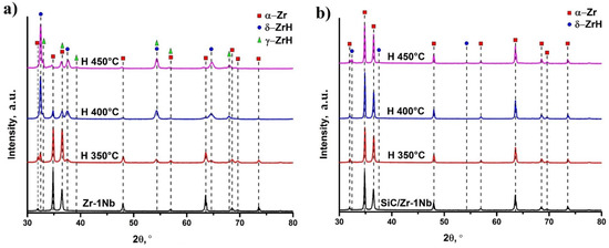 XRD patterns of hydrogenated Zr-1Nb (a) and SiC-coated Zr-1Nb alloy (b).