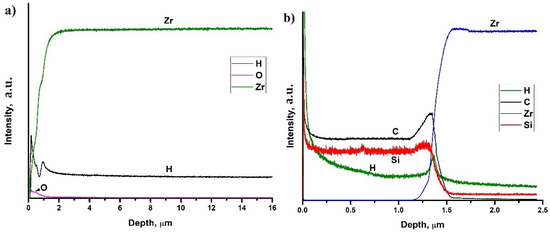 Figure 6 shows depth distribution profiles of elements in hydrogenated at 450 °C uncoated and SiC-coated Zr-1Nb alloys. Hydrogen homogeneously distributed in the surface hydride layer in the as-received sample (see Figure 6a). Probably, this is associated with high hydrogen diffusion rate into zirconium alloy at 450 °C and low cooling rate (2 °C·min−1), which leads to hydrogen redistribution. It should be noted that hydrogen has non-homogeneous distribution due to the oxide layer formation on the zirconium surface. Hydrogen has gradient distribution in the SiC-coated sample. Furthermore, hydrogen trapping is observed at the carbon-rich interface between the SiC coating and the alloy matrix. A small amount of hydrogen penetrates into the alloy depth, which leads to the precipitation of δ zirconium hydrides.
