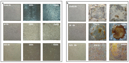 Surfaces after the corrosion test by (a) immersion in 3.5 wt % aqueous NaCl and (b) NaCl 0.025 g/cm2 deposition in a controlled environment.