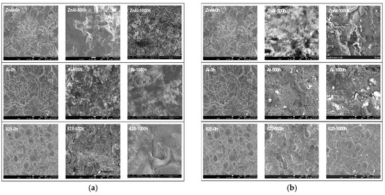 For the NaCl deposition at 80 °C and 80% RH, the surfaces of the ZnAl coatings show an oxide crystal growth at 500 h and needle-snapped iron oxide crystals at 1000 h. The SEM-examined Al coating surfaces with corrosion show that the strip-like structures disappear and oxide crystals appear. The electron-charging effects were obvious in the SEM analysis with ZnAl and Al coating surfaces. The Inconel 625 coating surfaces show that the granular-like structures crumble, and cracks are found with needle-shaped crystals. With the EDS analysis, the needle-shaped oxide was identified to be iron-rich metal oxides. Both 1000 h immersion and deposition corrosion tests show needle-like oxides, which indicates that the coating layers penetrate with the chlorine-containing corrosion, as shown in Figure 4.